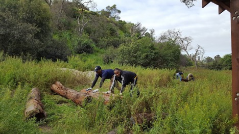 Next I was approached by Sam Kinsey to start the opening path of the grove and welcome circle as I now call it. We wanted to line the path and Jaime assisted us in this part as he told me that he had several trees that had been cut down in another part of the park. They were just piled in his maintenance yard and we were more than welcome to use them in the project. Sam jumped at the chance and they were delivered to the site for his use. What a wonderful way to repurpose the use for these trees that had served so well to give shade. The San Diego Chapter, DAR supported the Scouts on their day of service by bringing nourishment and morale support for the team of volunteers.