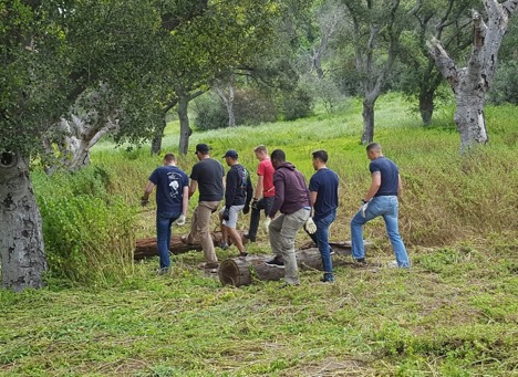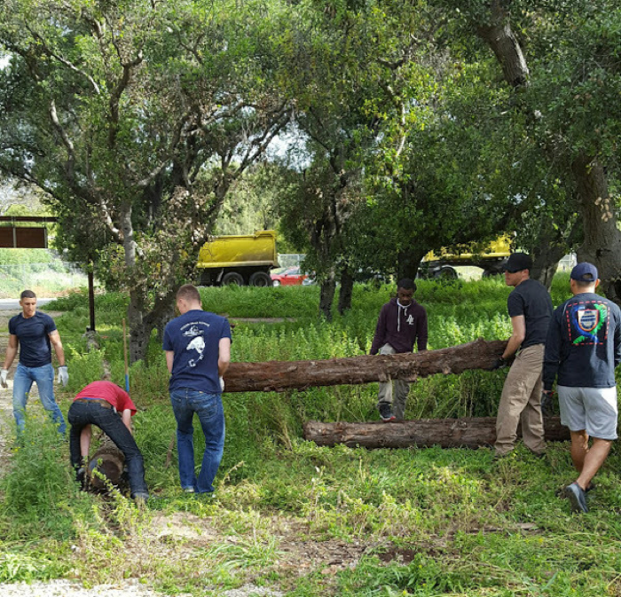 Next I was approached by Sam Kinsey to start the opening path of the grove and welcome circle as I now call it. We wanted to line the path and Jaime assisted us in this part as he told me that he had several trees that had been cut down in another part of the park. They were just piled in his maintenance yard and we were more than welcome to use them in the project. Sam jumped at the chance and they were delivered to the site for his use. What a wonderful way to repurpose the use for these trees that had served so well to give shade. The San Diego Chapter, DAR supported the Scouts on their day of service by bringing nourishment and morale support for the team of volunteers.